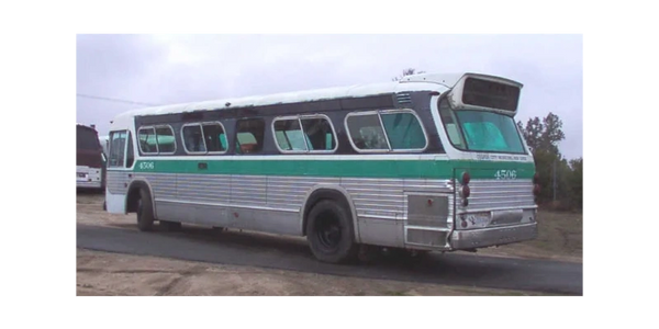 This bus completes the third series, 35-foot transit. It was purchased from Culver City after it was involved in an accident at a bus stop where a car struck and killed 4 people. I had the bus towed to my yard and repaired damage to the left front corner. I replaced the power plant and installed a VH 2 speed transmission. After that, the bus ran good for over 20 years without incident.